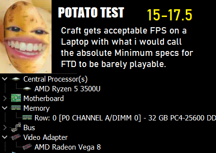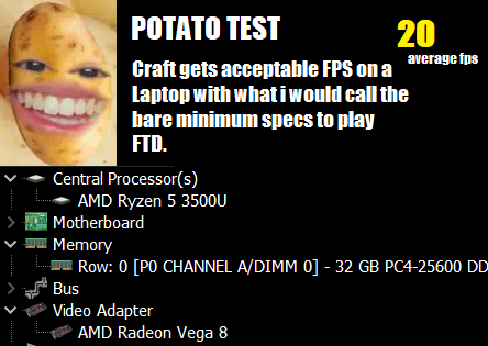 The Potato Test is a method to ensure your craft are playable on even the slowest computers one could use to play FTD.